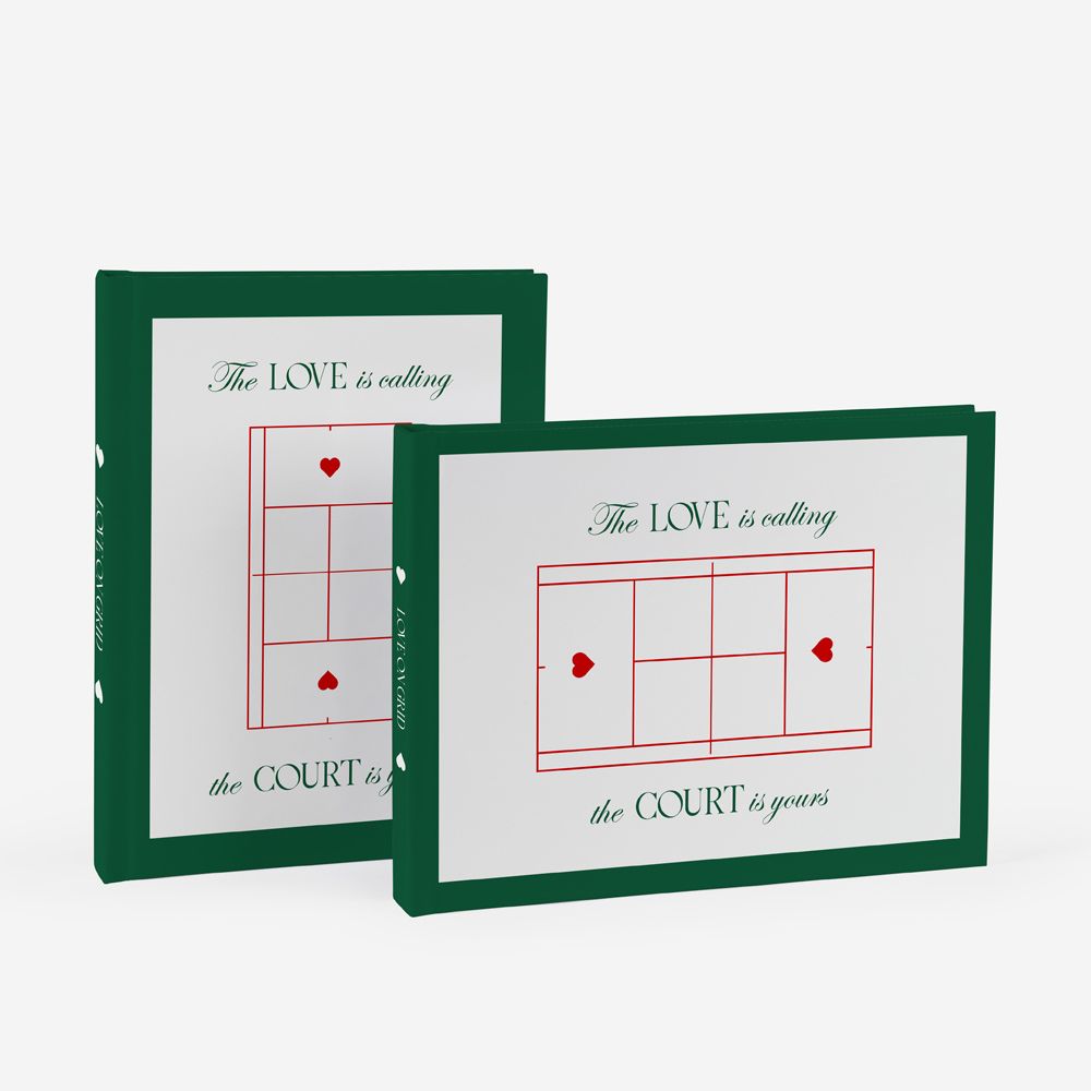 Inspirado na tendência Tennis Core desta temporada, o tema Love on the Grid transporta a estética preppy e desportiva diretamente para a capa das tuas memórias. Com o verde icónico do court, linhas minimalistas de jogo e um toque de elegância tipográfica, este design é o "match point" ideal para casais dinâmicos que encaram o amor como a melhor partida das suas vidas.