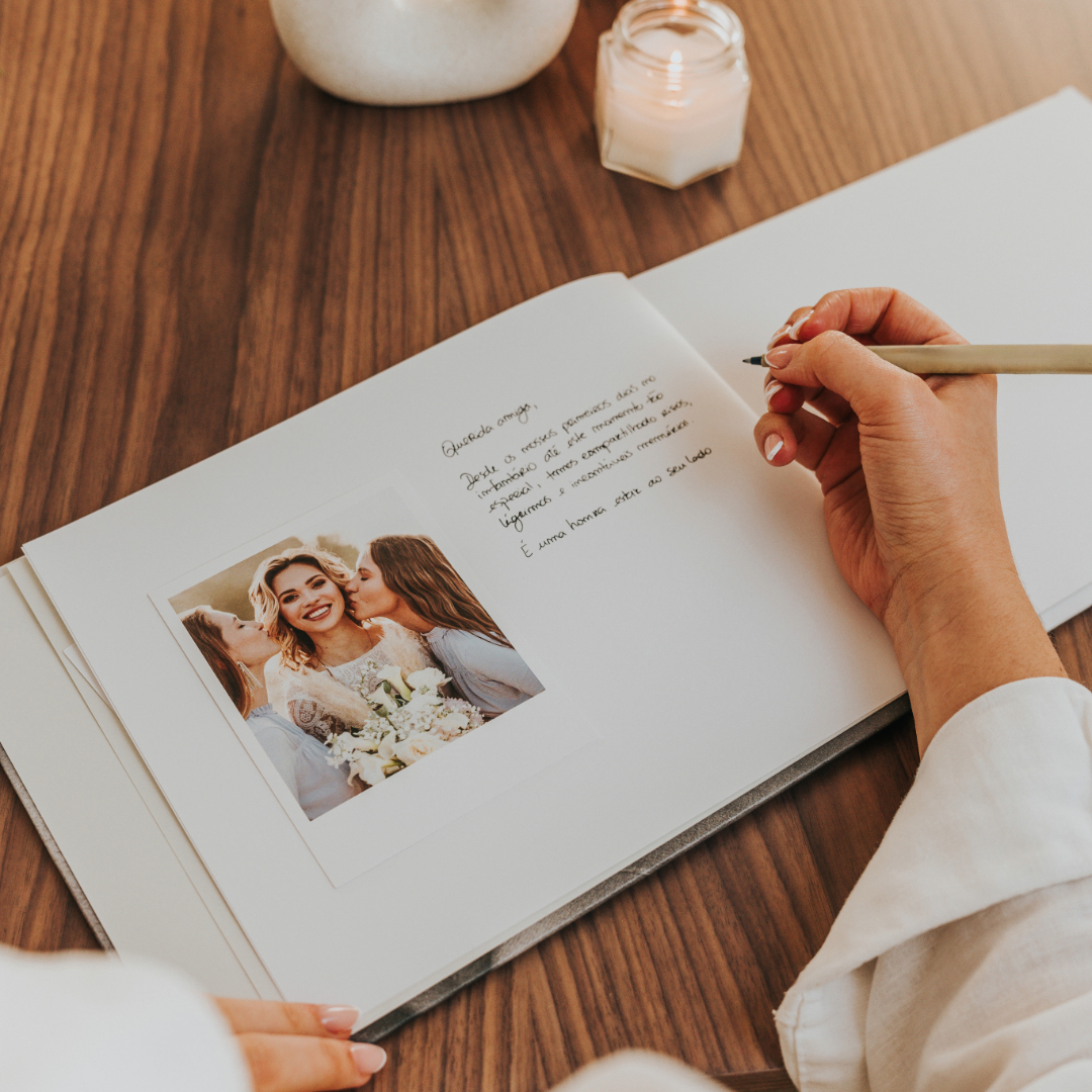 Fotografias com Espaços em Branco: Personaliza o Álbuns Press com fotos de casal, amigos e família, deixando bastante espaço branco nas páginas. Isso permite que os convidados escrevam as suas mensagens ao lado das fotos, criando uma mistura de imagens e palavras que capturam a essência do dia.